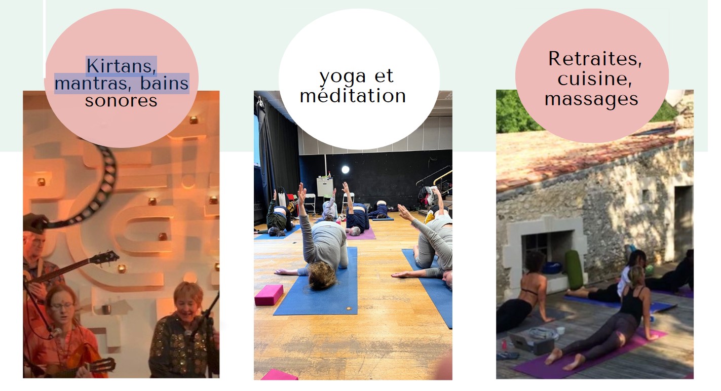 Nous souhaitons créer des lieux de pratiques éphémères ou pérennes en adaptant nos pratiques aux besoins des élèves dans le respect de leur niveau et de leurs corps. Nous proposons également des évènements autour de la culture du yoga (kirtans (chant de mantra) introduction à la cuisine végétarienne, méditation…) ainsi que des workshops ou des séjours (Retraites- weekend)
